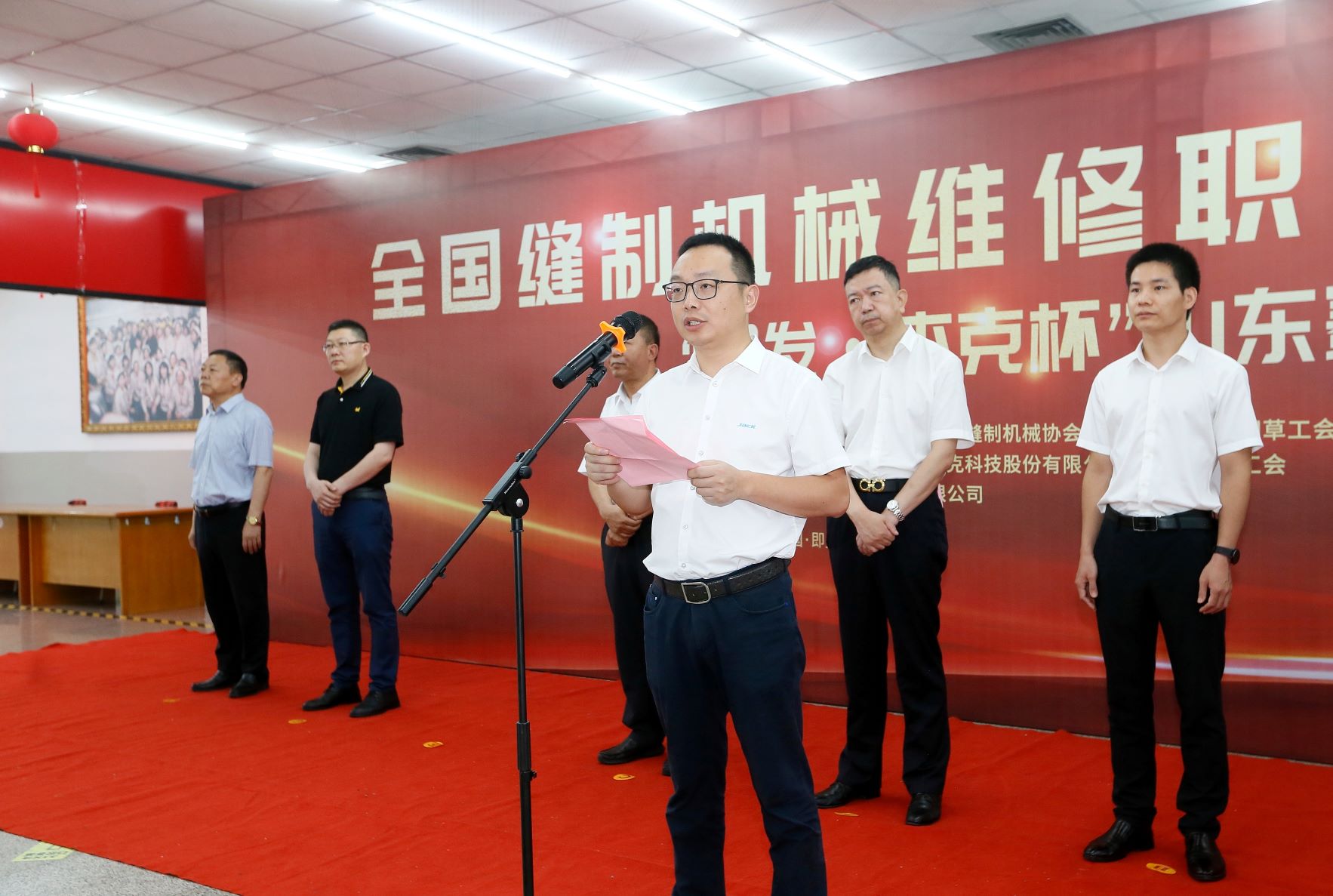 中國財貿輕紡煙草工會(huì )工作部副部長(cháng)劉軍淇;中國縫制機械協(xié)會(huì )理事長(cháng)楊曉京;副理事長(cháng)吳吉靈;監事長(cháng)、總裁判林建龍;即墨區總工會(huì )主席衣服坡;即墨區總工會(huì )黨組成員、二級調研員韓吉明;杰克科技股份有限公司輪值執行總裁邱楊友;寧波勇耀縫制機械有限公司總監李世海;我集團楊為東、于希超、周遵琳等領(lǐng)導及嘉賓、裁判、選手近百人參加了開(kāi)幕式。開(kāi)幕式由中國縫制機械協(xié)會(huì )副理事長(cháng)吳吉靈主持。